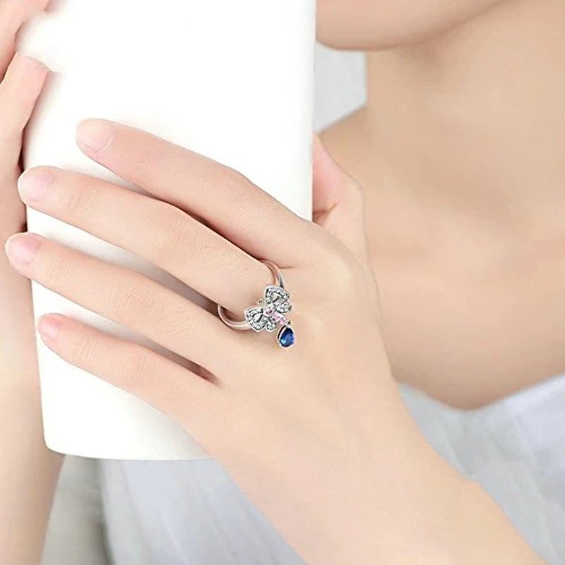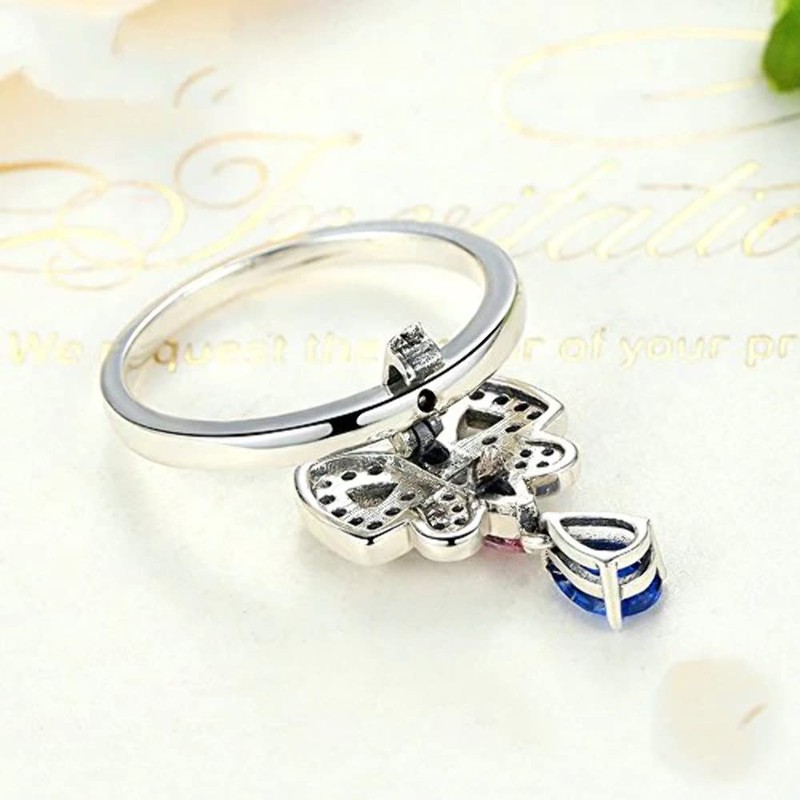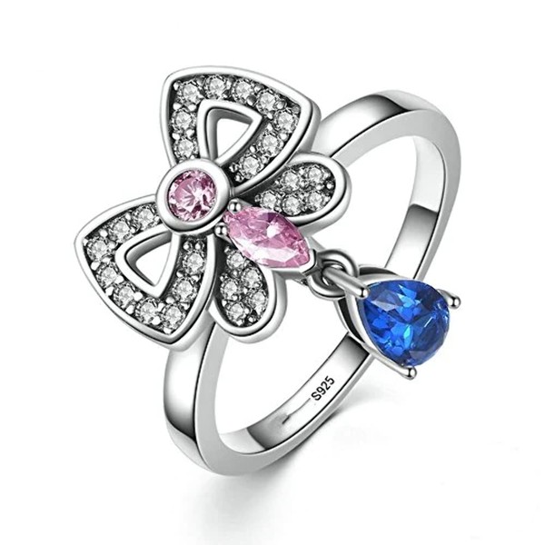 PAHALA 925 Sterling Silver Pink Blue Crystals Bow-Knot Cubic Zirconia Pave Wedding Engagement Band Ring 7