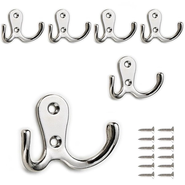 PAIDASHU 6-Pack Double Coat Hooks, Metal Hooks, Wall-Mounted Coat Hooks with Screws for Hanging Clothes, Hats, Towels, Keys, Kitchenware, for Living Room, Bedroom, Bathroom, Kitchen (Silvery)