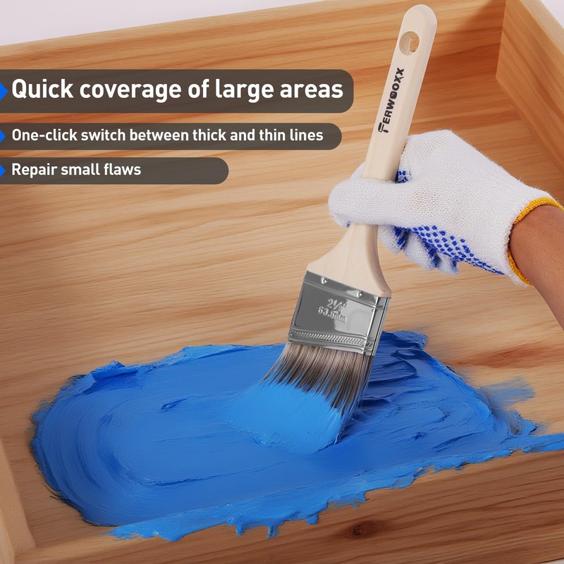 - [Premium Paint Brush] Premium mixed bristles and a durable stainless steel sleeve enhance paint pickup, minimizing repeated dips. The paint brush elasticity ensures smooth, even coverage with fewer brush marks for a flawless finish