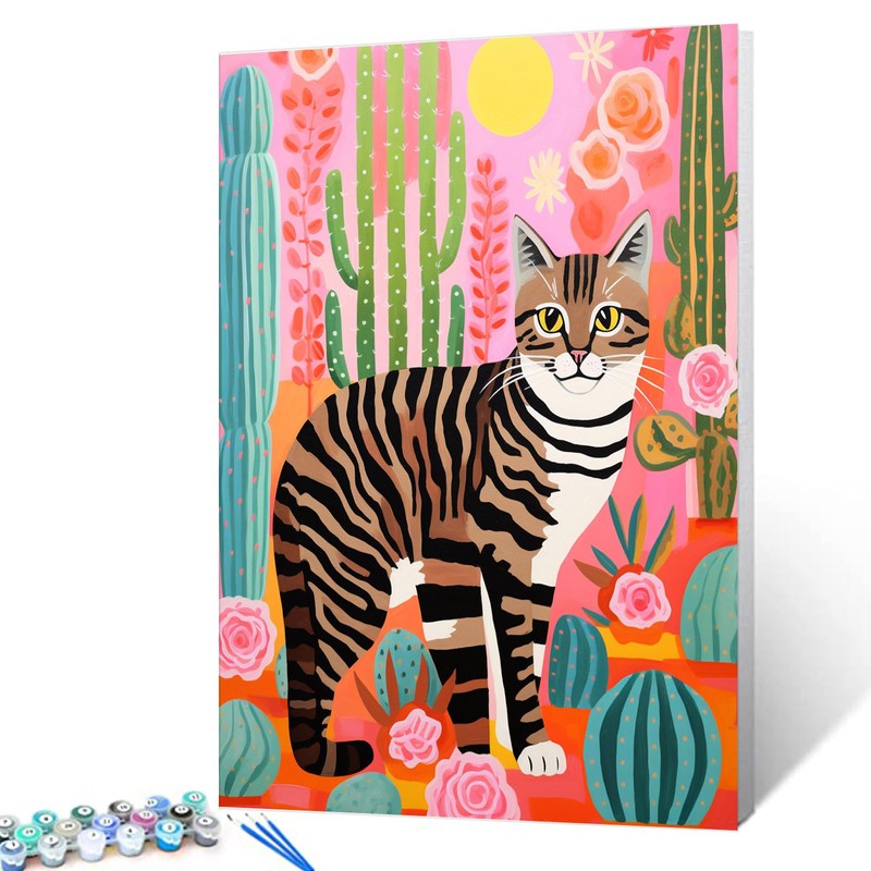 Paint by Number Cat Near Cactus DIY Painting On Canvas with Brushes Acrylic P...