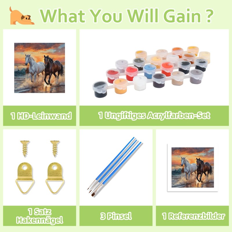 - What you will get: painting by numbers adults with 1 waterproof canvas, 3 nylon brushes, 1 instructions, 1 line drawing, 1 colour guide, enough matching pigment and hook nails.