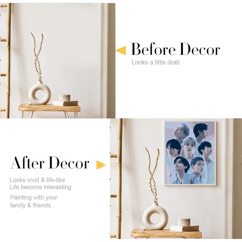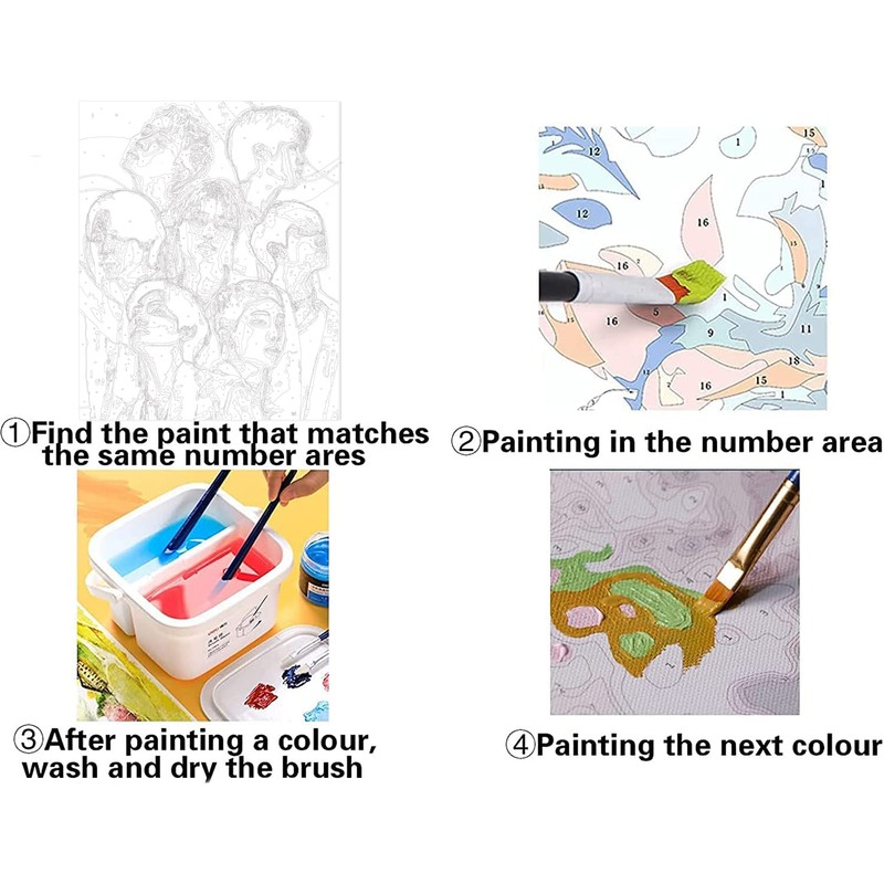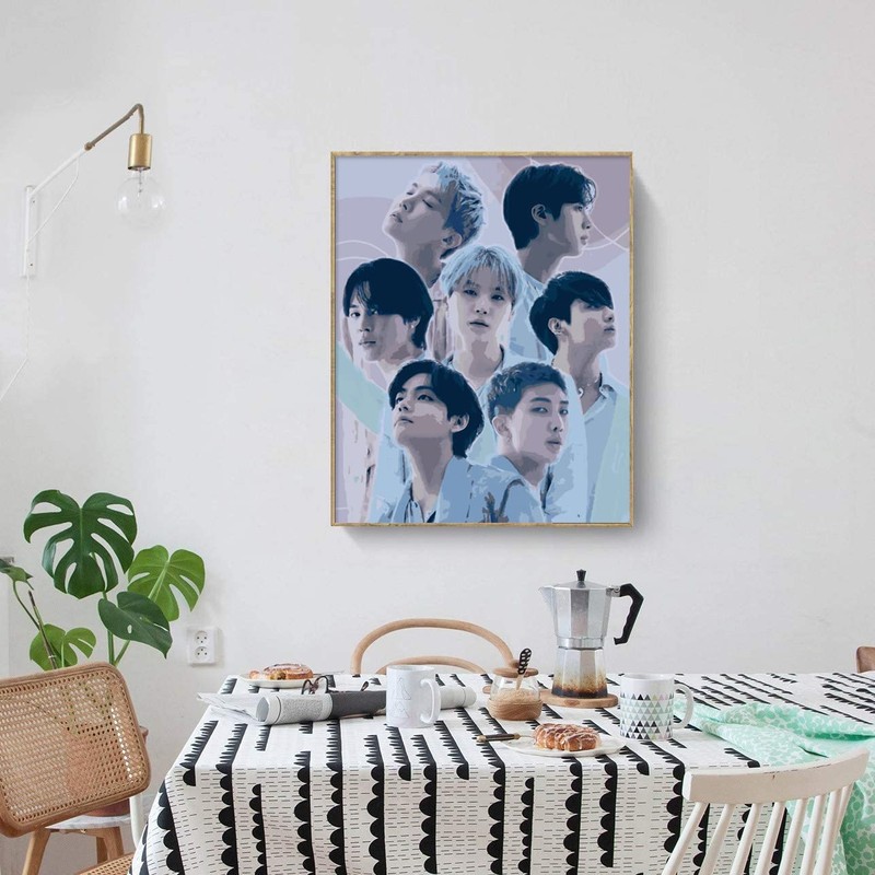 • ♥ What you get: 1 BTS pre-printed canvas (without frame), 1 set of acrylic paint, 3 high-quality brushes, 1 wall hanging kit, 1 colored postcard guide, 1 paper copy numbered canvas for reference