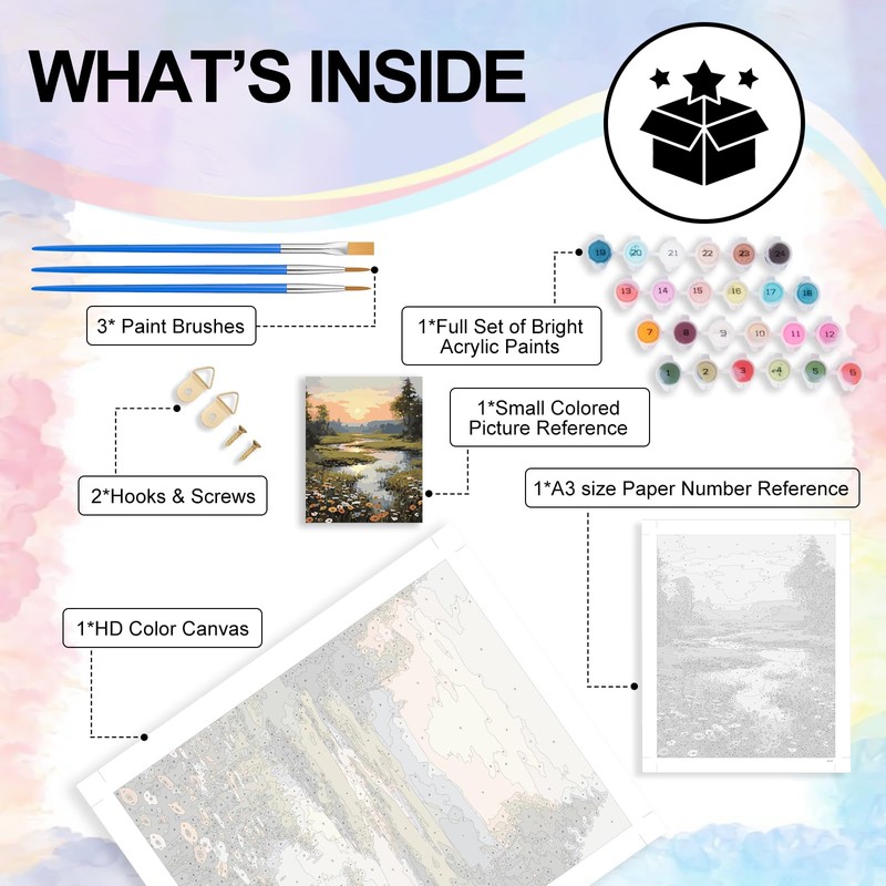 - Yezavesu paint by numbers kit for adults include: 1 pre-printed HD canvas (Without Framed), 3 different-sized paint brushes, 1 set of acrylic paints, 2 sets of hooks, and 1 number painting paper guide, Open the package and you can start painting immediately