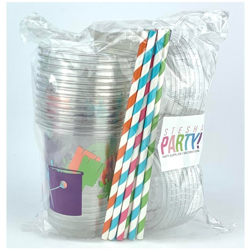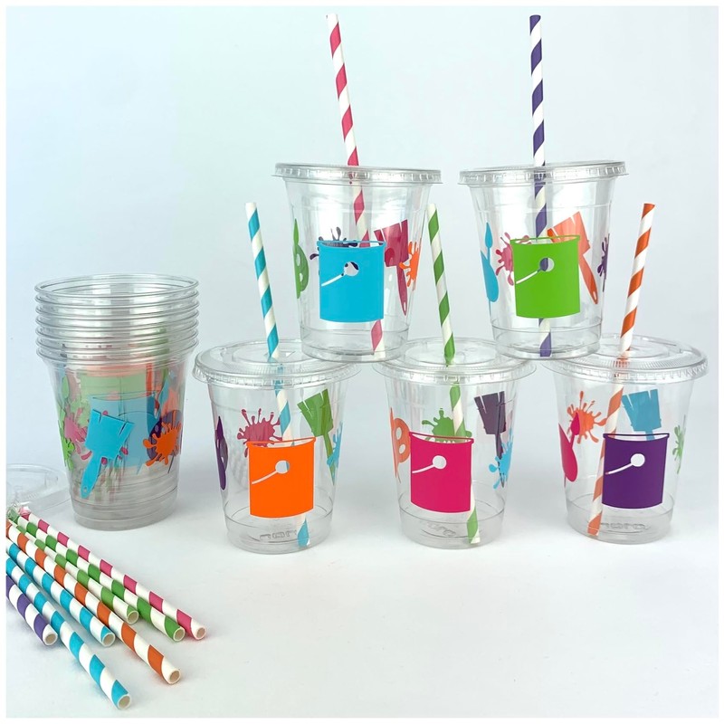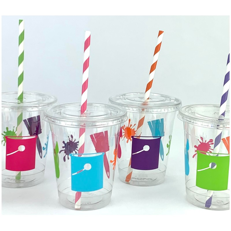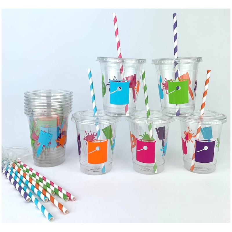 Paint Party Supplies Plastic Disposable Cup Set with Lids & Straws, Set of 12