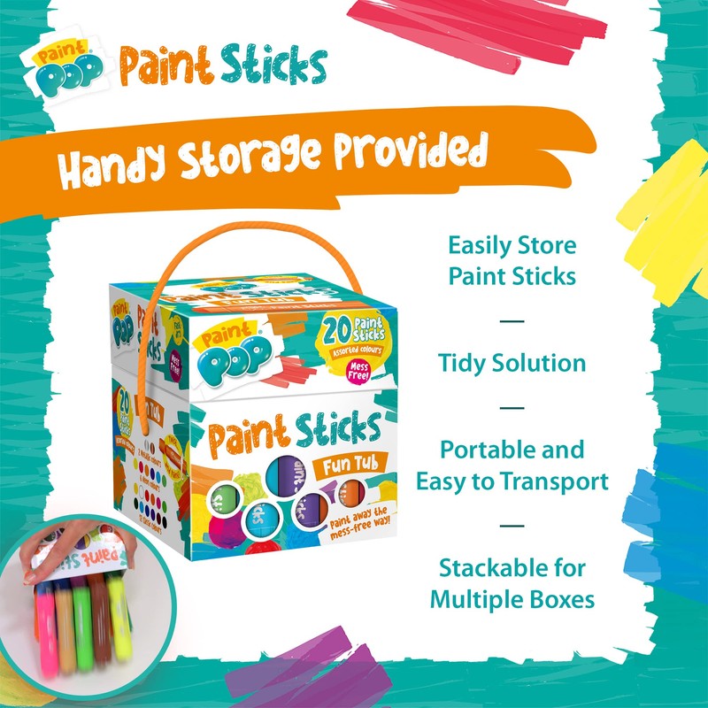 - FAST DRYING & EASY CLEAN-UP – Our Paint Pop Paint Sticks are fast-drying, often in under 60 seconds. The glide-on paint can be easily applied and as they don’t require any brushes or water far less time is needed for clearing up. Painting play can then be a happier, less stressful experience for both child and parent.