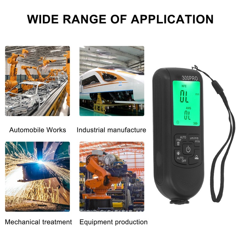 1、Smart Testing: The coating thickness gauge can record the average value, maximum value, minimum value, and quantity value at the same time. The measurement range of 0‑2000um and high accuracy ensure easier working. With automatic shutdown function to save battery power. 2、Clear Display: Paint depth gauge with large display will clearly show the metal type, operating mode, data, battery status and reading in µm or mils. 3、Wider Utility: Used to measure the thickness of coatings and inks, widely used in manufacturing, metal processing industry, chemical industry, commodity inspection and other fields. 4、Better Design: The high definition display screen of the paint meter has a background light, making it much easier to read the data. The non slip design is comfortable to hold, which can be placed anywhere and is easy to carry. 5、Reliable Work: Able to inspect the paint thickness as well as detecting the concealed dent and blemish, very practical and reliable.