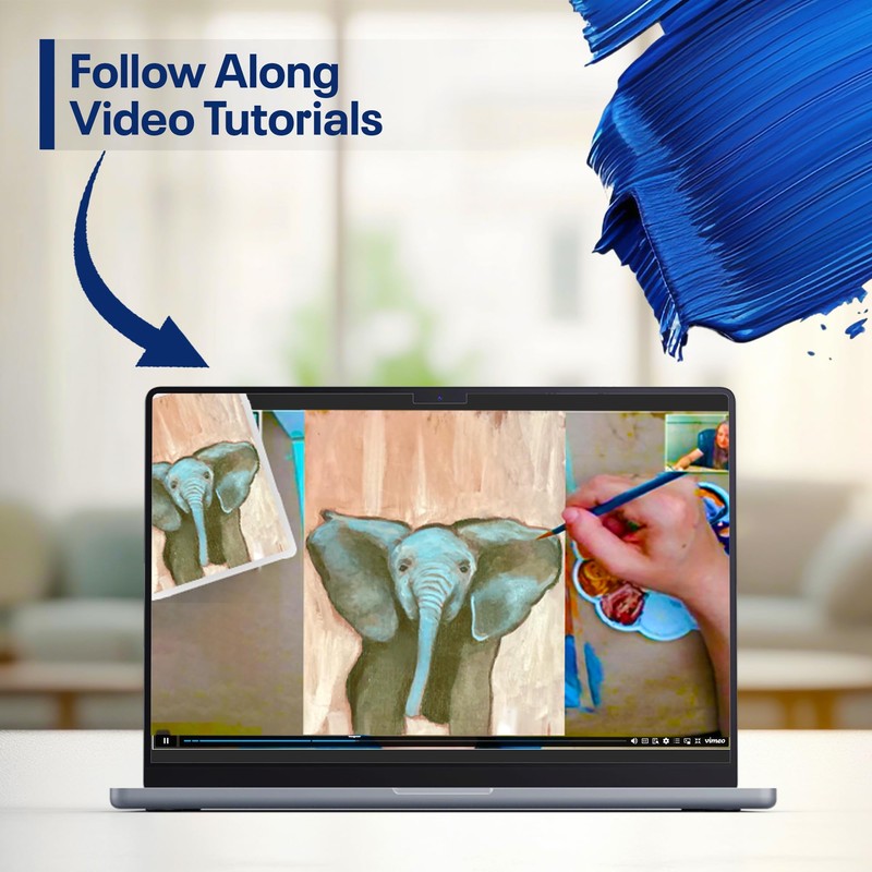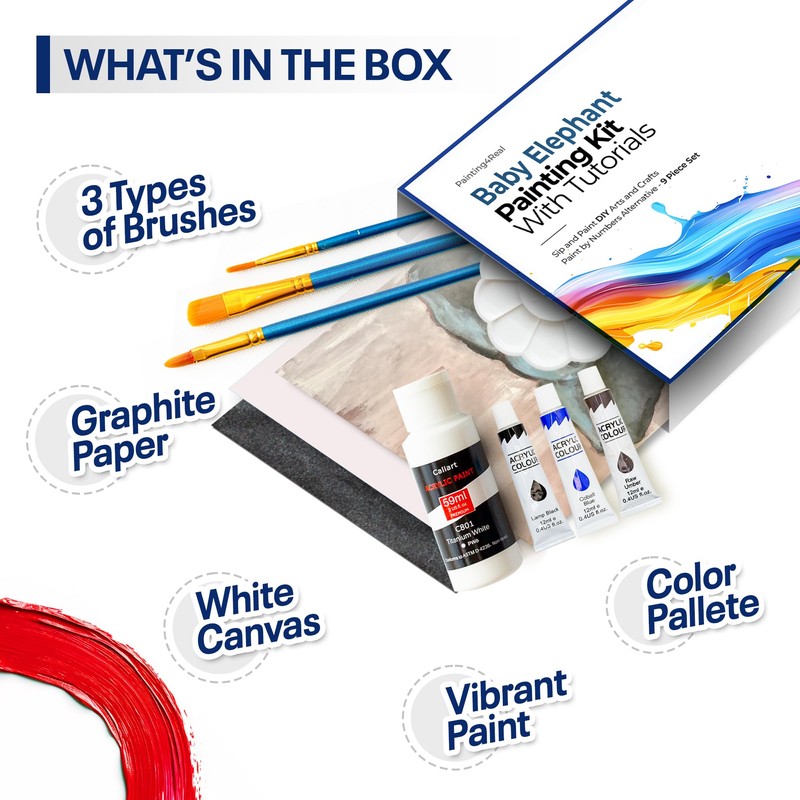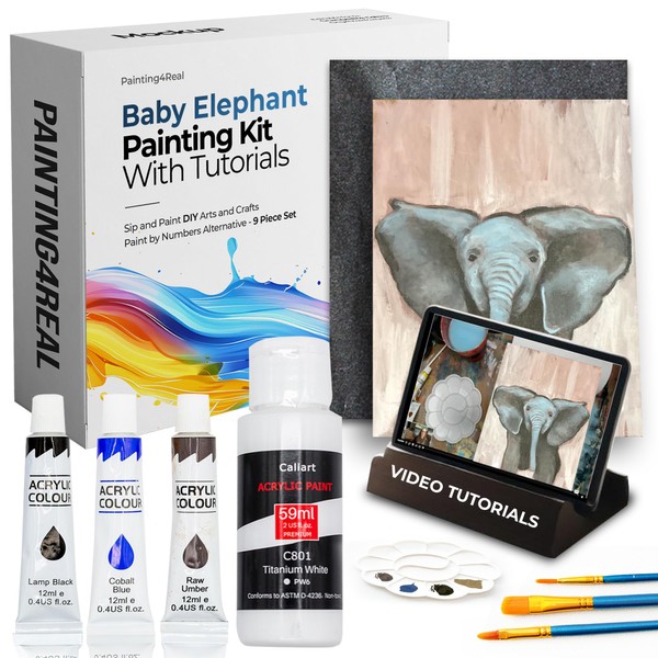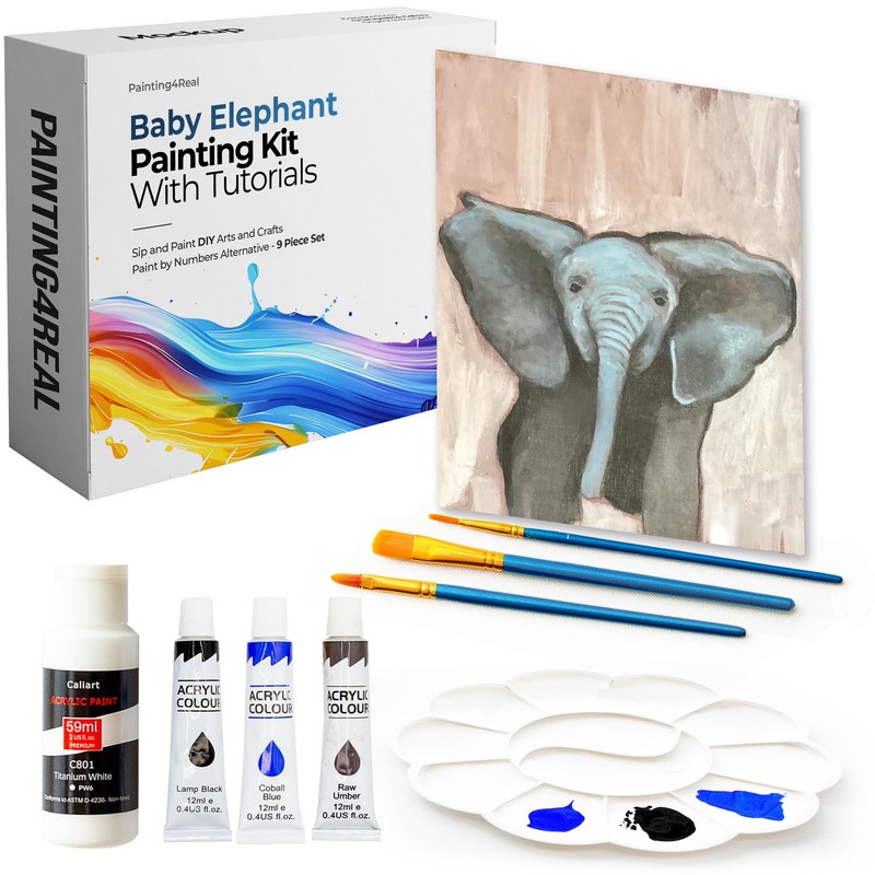 Painting4Real DIY Painting Class Kit for Adults with Video Tutorials: Learn to Paint Baby Elephant – How to Paint with Acrylics – Painting & Art Supplies – 9 Piece Acrylic Paint Set