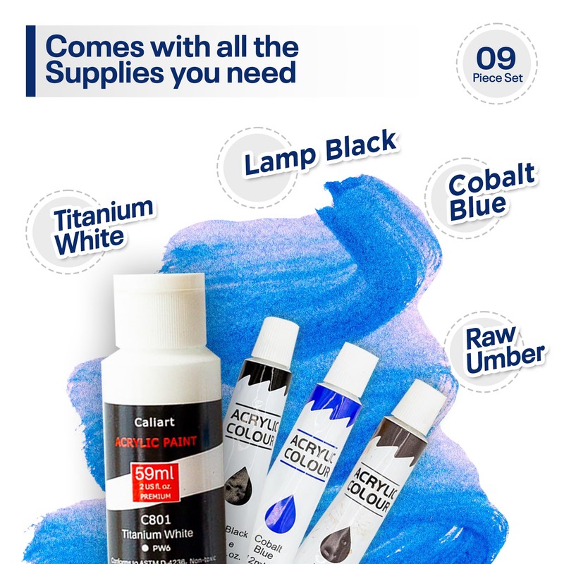 - Comprehensive 9-Piece Acrylic Painting Kit: Our painting kit includes all the materials needed to bring your creativity to life. High-quality acrylic paints, a durable paint palette, a set of brushes, graphite paper, and a canvas panel. Use the exact same materials as the instructor for a seamless, enjoyable painting experience from start to finish.