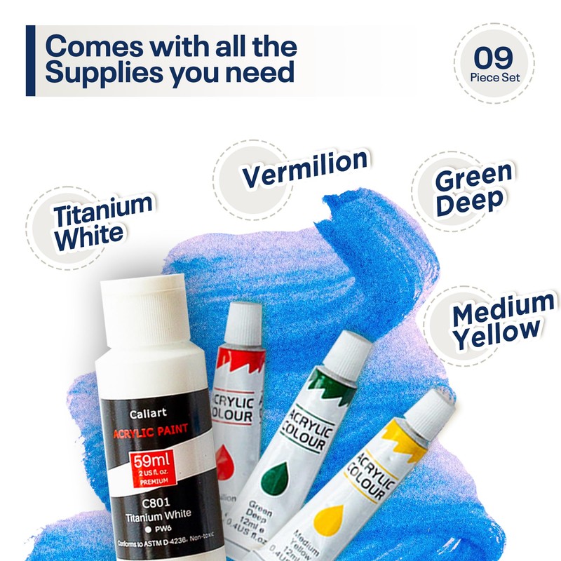- Complete 9-Piece Acrylic Art Kit: Our adult and kids painting set includes all the materials needed to bring your creativity to life. High-quality acrylic paints, a durable paint palette, a set of paint brushes, graphite paper, and a canvas for painting. Use the exact same materials as the instructor for a seamless and enjoyable painting experience.