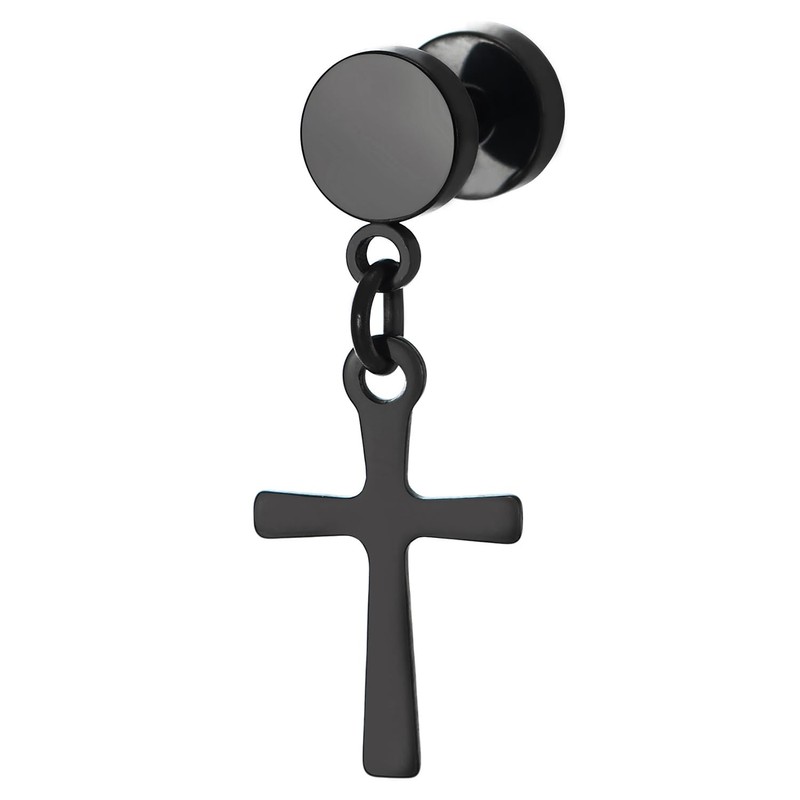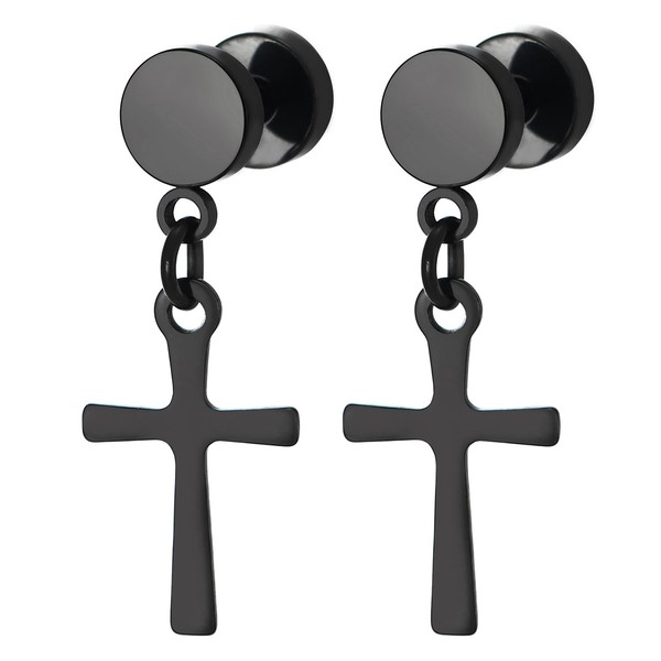 - Pair Black Circle Screw Stud Earrings with Dangling Cross, Unisex for Men Women