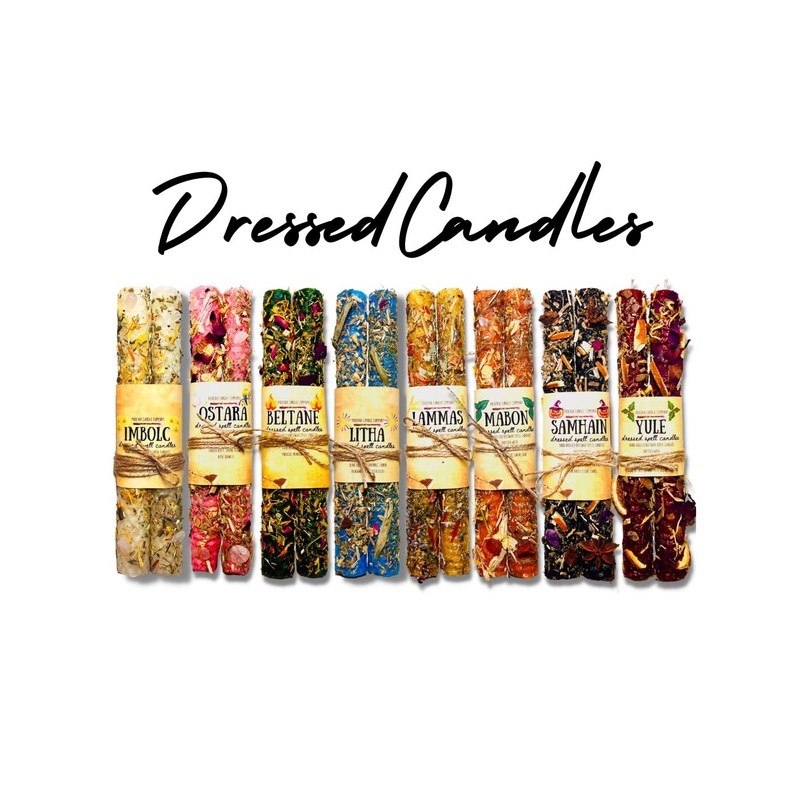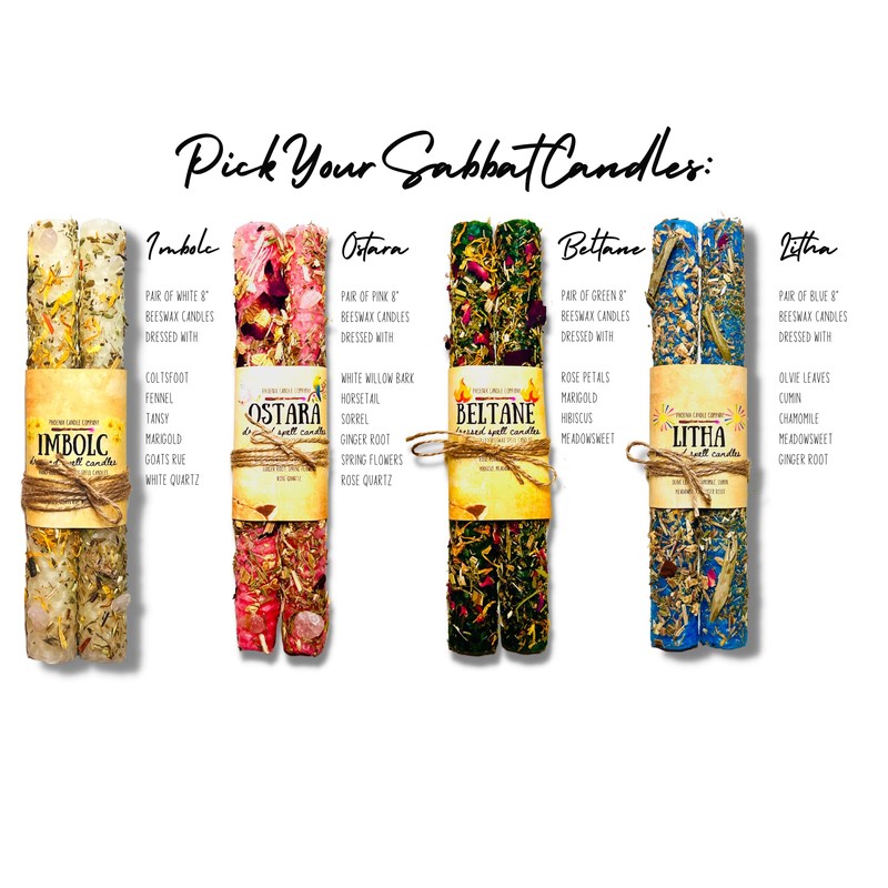 - BEAUTIFUL SABBAT CANDLES - Beautiful hand-rolled beeswax altar candles decorated with their correpsonding magical herbs, flowers and stone chips (if applicable).
