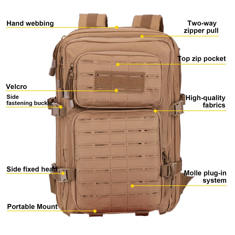 - 【MOLLE System Tactical Backpack】:Made of high-density materials, this Military backpack is durable, waterproof and of good quality.Equipped with a MOLLE webbing system for a custom fit. Reinforced heavy-duty buckles ensure durability in harsh conditions.