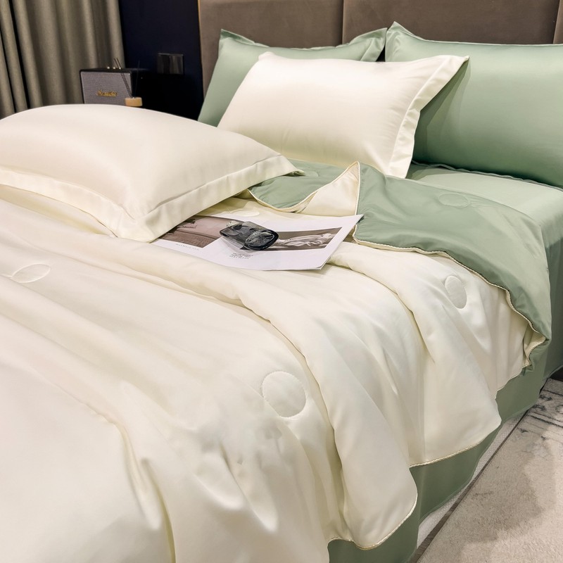 Our Silk-Like Summer Comforter Set delivers the elegance of silk with the practicality of polyester. The water-washed fabric creates a subtle sheen and ultra-soft handfeel, while the lightweight polyester fill ensures airflow for sweat-free nights.