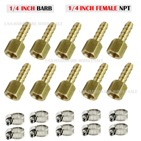 PAKA TOOLS (10 Pack) 1/4" Hose Barb X 1/4" FEMALE NPT Brass Pipe Fitting NPT Thread + Clamp