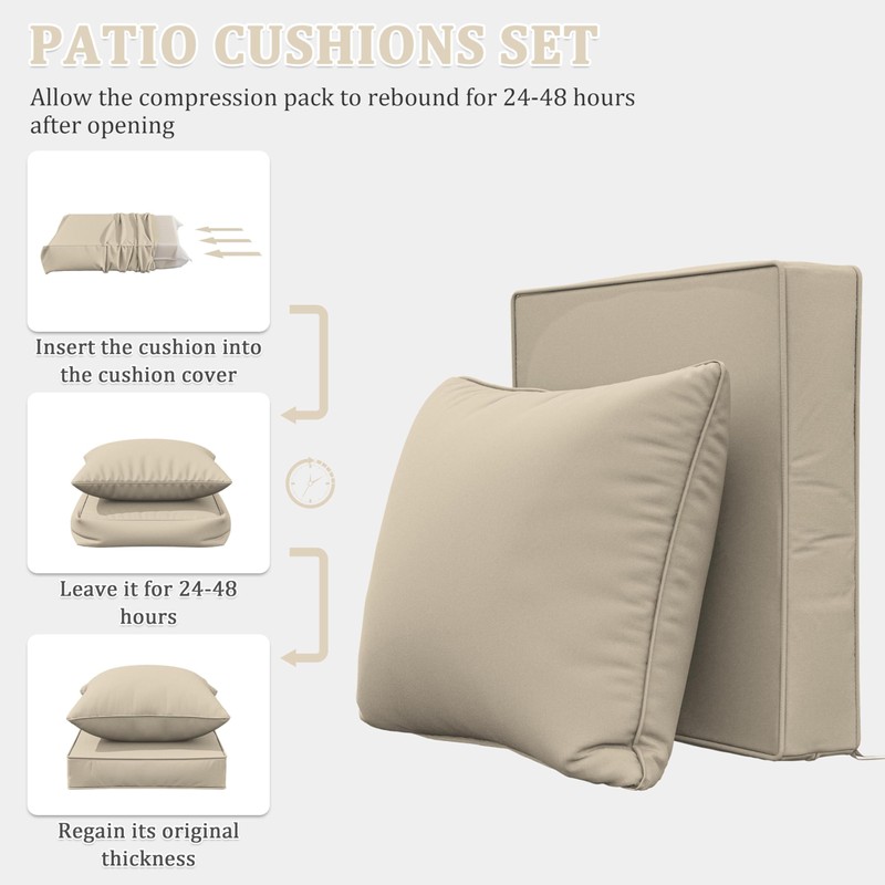 - đź’ˇABOUT THE PRODUCT - Our seat and back cushions feature a universal design compatible with most deep outdoor seating. Delivered in a compressed package, they fully expand within 24-48 hours. For any issues, contact us for a resolution within 24 hours!