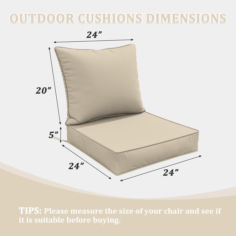 - đź’ˇSIZE OPTIONS - Our patio seat cushions includes: 1 seat cushion: 24"W x 24"D x 5"T; 1 back cushion: 24"W x 20"D. Please measure your furniture before purchasing to ensure a proper fit. Our outdoor chair cushions come in a variety of colors and sizes, making them ideal for outdoor chairs, dining chairs, and sofas.