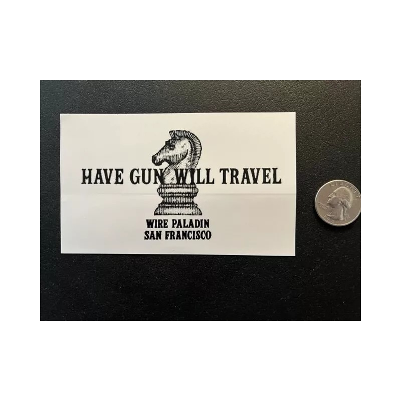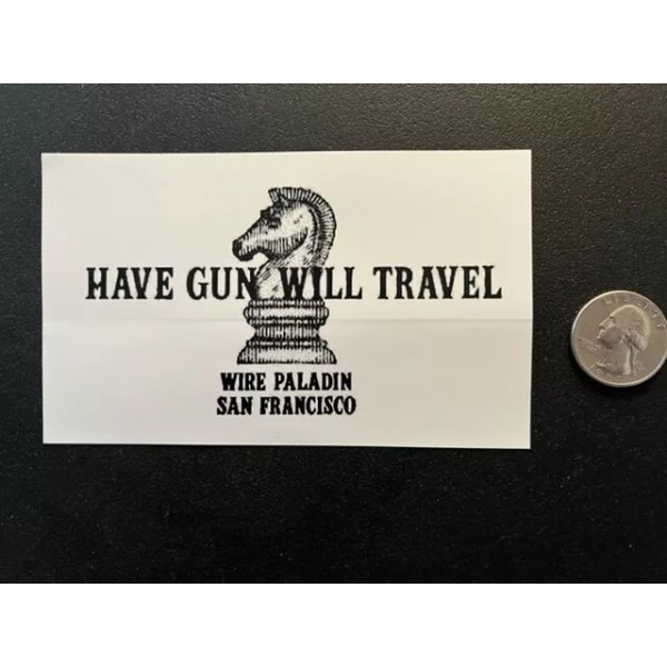 " Have Gun Will Travel " Paladin, San Franciso from the TV series. Great for the gun owners This is a 3" x 5' DECAL ON GLOSSY STOCK WITH A PEEL OFF BACK TO ADHERE. You won't find this anywhere else.. place on gun safe, vehicle or home windows or doors Also have a normal size business card for sale...thanks for looking..Please check out my other items up for sale and thanks for looking. Ship to Continetal USA only SORRY, shipping costs keep going higher.