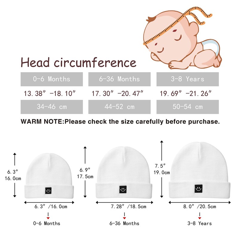 - Baby Beanie Size: 0-6 Months (6.29”-6.99”), 6Months-36Months(13.38”-18.92”), 3Years-8Years (19.90"-21.28")