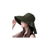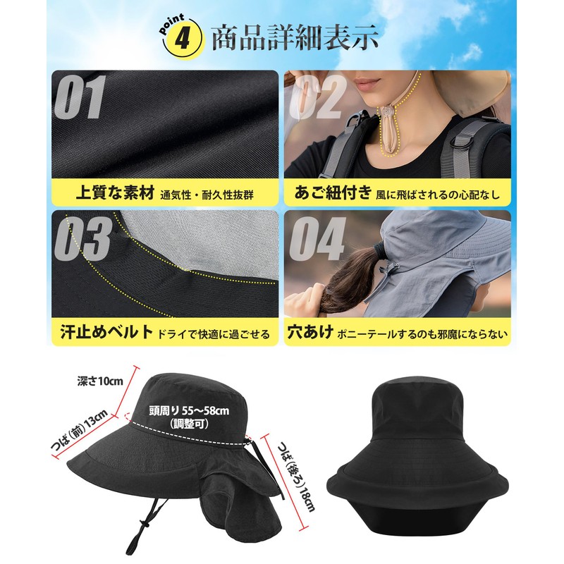 - (Pony Tail Hole & Chin Strap Without Wind) This is an integrated wide brim hat that covers the back of the neck, but the back has a hole to release your hair tied in, making it recommended for women with ponytails. Adjustable chin strap allows you to adjust the fit around your head. As long as it is properly adjusted, the hat will stay firmly in place and won't be blown away by the wind, making it safe for outdoor activities and bicycles