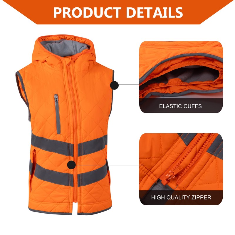 - 【Fabric】:300T polyester Tuff single side machine quilted + lining 280g fleece, more warm, comfortable and durable. The exterior is fluorescent reflective yellow material, with a lattice press process, more stylish. Using double sutures, more firm and durable. The hooded design can protect your head from freezing in the cold winter. As a winter vest, you can wear different clothes under the vest to match