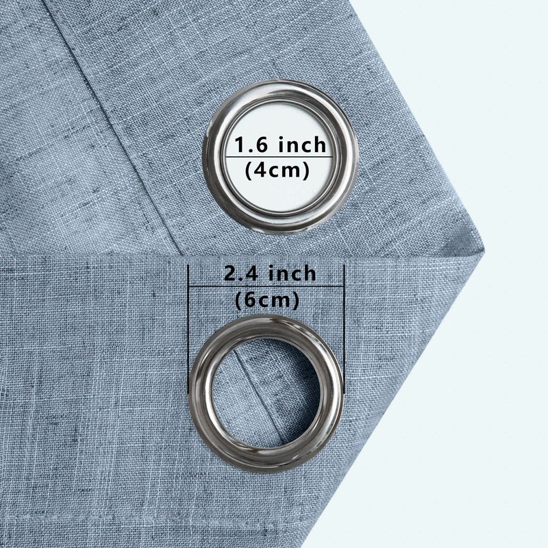 - PAIR SET: Pack of 2 pieces linen sheers.Total width is 104 in wide to cover traditional window treatments.Single panel curtain measures 52” wide.Each panel has 8 silver grommets ( 1.6 inch inner diameter) on curtain top for silky sliding on curtain rods /poles.