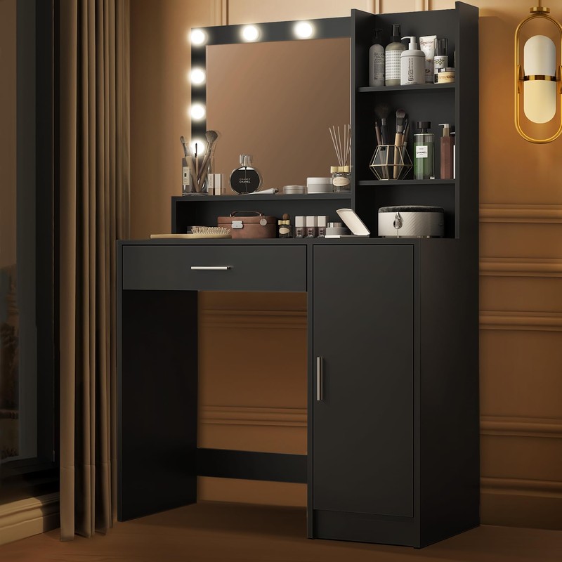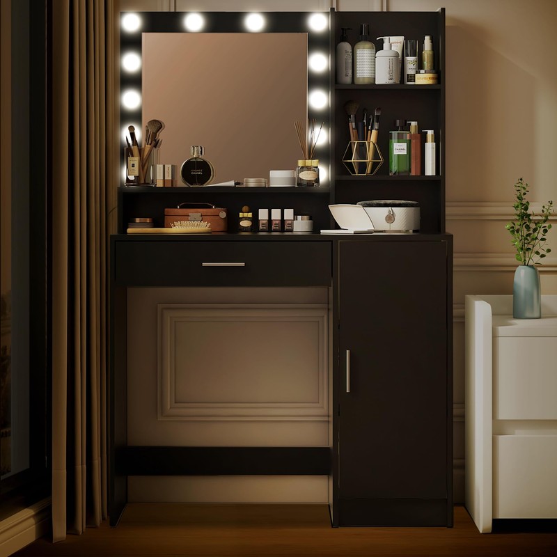 Palimder Vanity Desk with Mirror & Light, Large Drawer & Three Level Storage Dresser, 3 Lighting Modes Adjustable Brightness, Bedroom Dressing Table (Black)