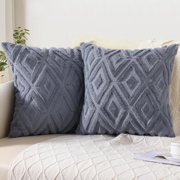Pallene Soft Faux Fur Throw Pillow Covers 18x18 Set of 2 - Plush Wool Decorative Couch Pillow Covers for Sofa Bed Living Room - with 3D Diamond Pattern - Blue Grey