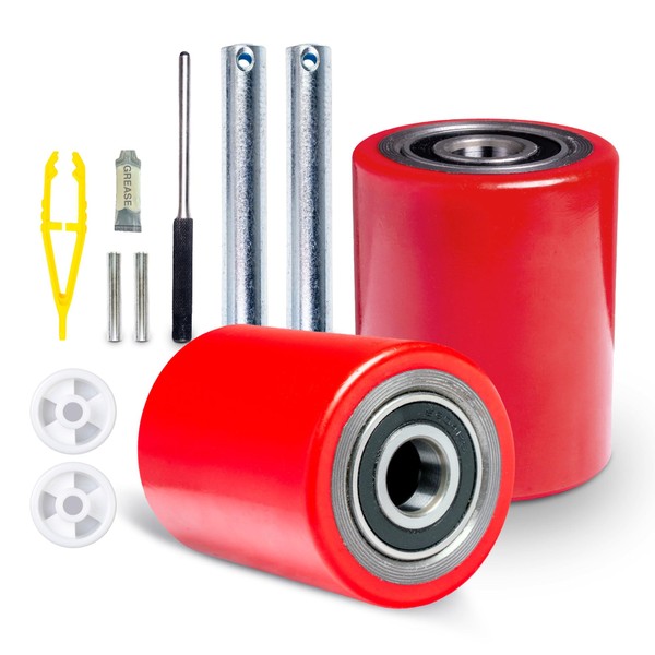 Pallet Jack/Truck Load Wheels Full Set with Axles and Entry Exit Roller 3" x 3.75" with Bearings ID 20mm Poly Tread Red