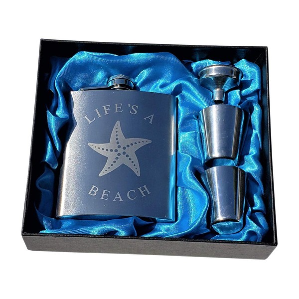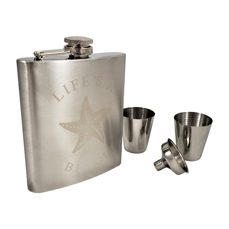 Give as a Gift Impress an important person in your life or keep this set for yourself. Perfect for anyone in your life who enjoys a little drink – family, friends, coworkers, clients, or anyone else in your life (including yourself). This is the perfect set for to give to someone who enjoys the beach, lounging by the pool, or visiting exotic, tropical locations. What's Included This set includes a rectangular flask with a beachy message engraved with a fun starfish. The flask is made of stainless steel, two shot glasses, and a convenient funnel. All of this is delivered in an elegantly packaged gift box. Keep 7 oz of your favorite drink with you in an impressive flask. This set contains two shot glasses so you can enjoy a drink with a friend. Who likes to spill liquor? This set conveniently comes with a funnel makes so you don't miss a drop when pouring into the flask. Quality The set is made of 304 grade stainless steel which is specially formulated with 18% chromium and 8% nickel to resist rusting. This is the same grade of stainless steel used in kitchens and restaurants because of its ability to avoid rust and corrosion.