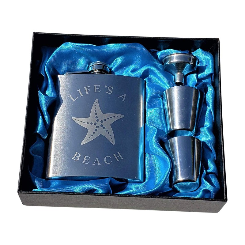 • Unique look - Stylish, rectangular-designed flask holds 7 oz of your favorite beverage engraved with a starfish icon and a beachy message.