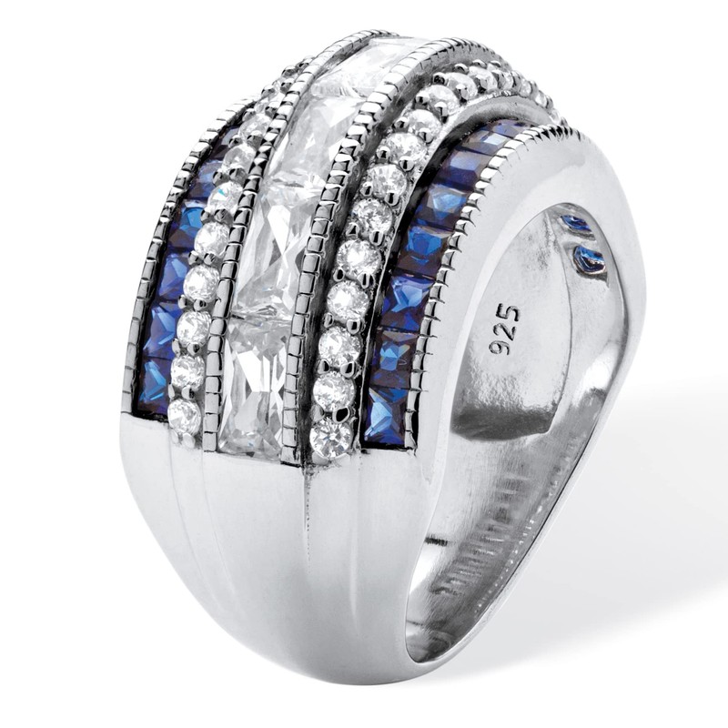 PalmBeach Platinum-Plated Sterling Silver Emerald Cut Cubic Zirconia and Simulated Princess Green Emerald or Blue Sapphire Anniversary Ring Size 7