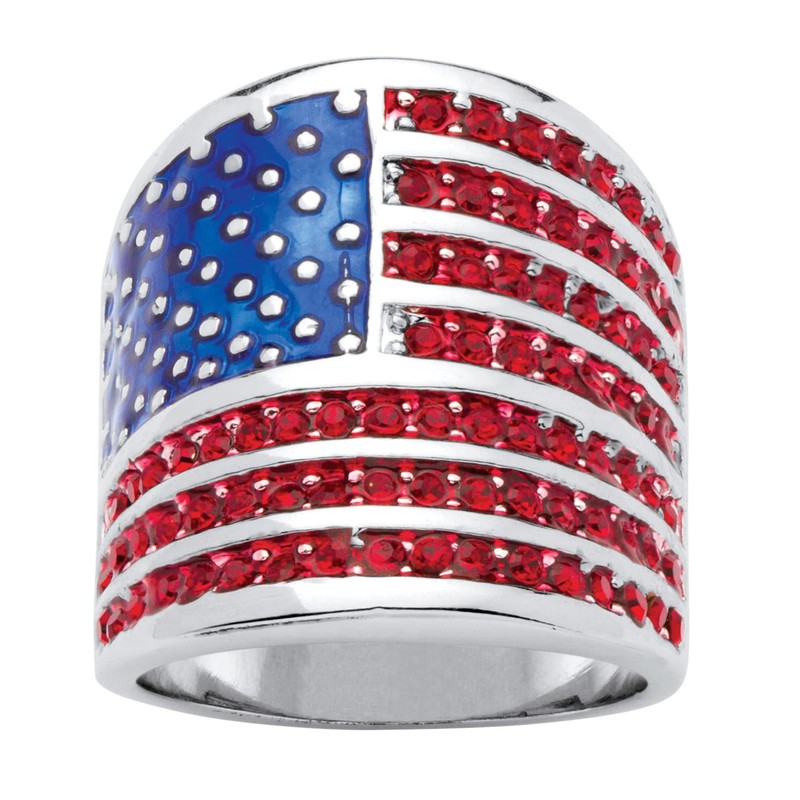 PalmBeach Silvertone Round Simulated Red Ruby and Enamel American Flag Ring Sizes 5-10 Size 9