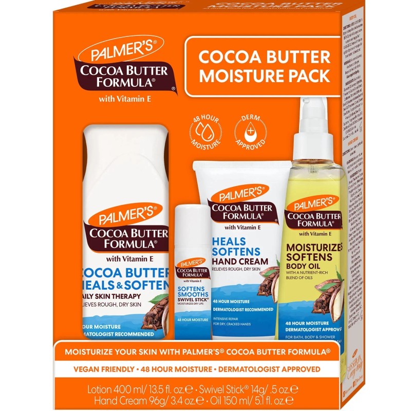 Pamper your skin with the luxurious care of Palmer's Cocoa Butter Formula Moisture Pack, a thoughtfully curated collection designed to deeply hydrate, heal, and soften your skin from head to toe. This indulgent set includes four essential products: a silky Body Oil, a rich Daily Body Lotion, a soothing Hand Cream, and a convenient Swivel Stick, ensuring hydration and nourishment wherever you need it.
