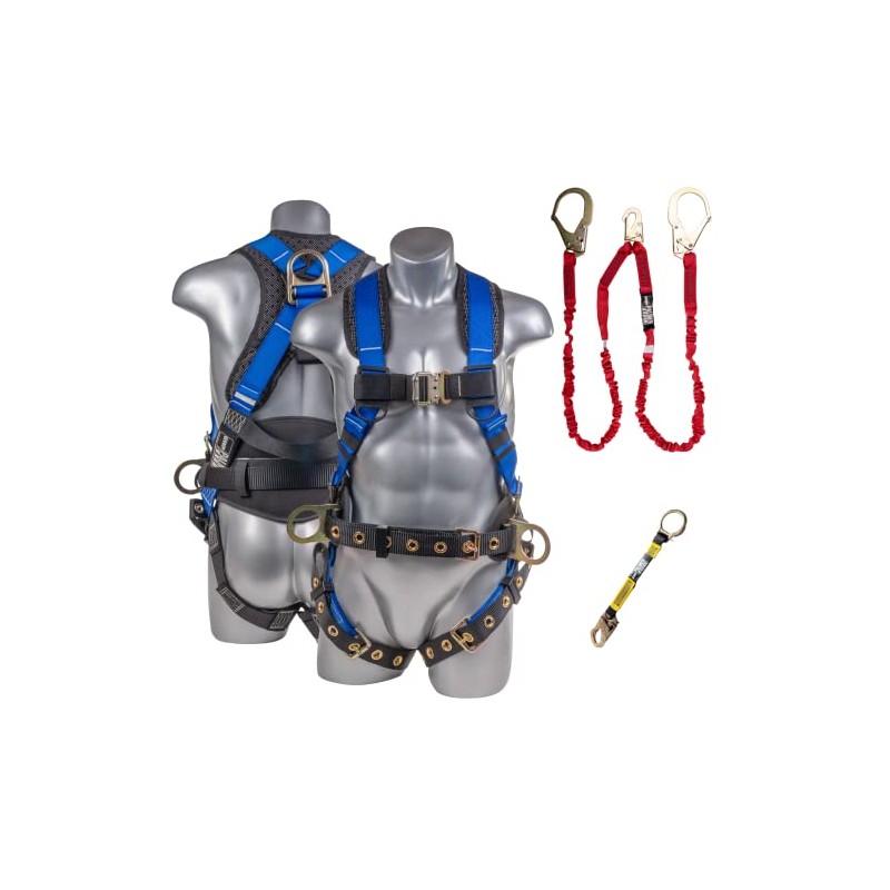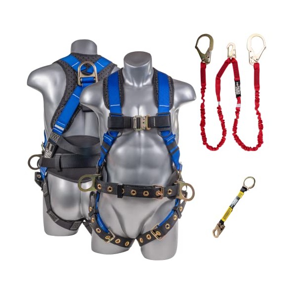 Palmer Safety Fall Protection Hammerhead Kit I 5pt Safety Harness, 6' Double Leg Lanyard, 18" D-Ring Extender (Blue - MD)