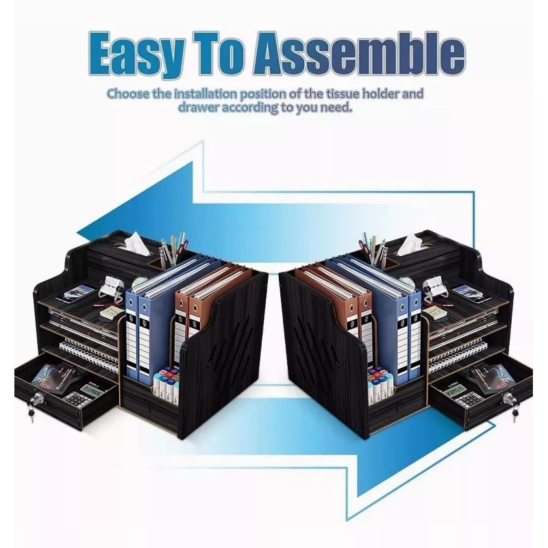 Organizadores de escritorio de tablero de PVC respetuosos con el medio ambiente: el organizador de escritorio con cajón está hecho de tablero de madera ecológicaViene sin pintura ni formaldehído,construcción resistente, segura y no tóxica,respetuoso con el medio ambiente, a prueba de humedad, impermeable y no es fácil de envejecer. El organizador del cajón cuenta con1 cajón con cerradura /2 compartimentos para carpetas/2 portabolígrafos/1 compartimento grande/2 armarios A4 multifunción/ 1 caja de pañuelos.