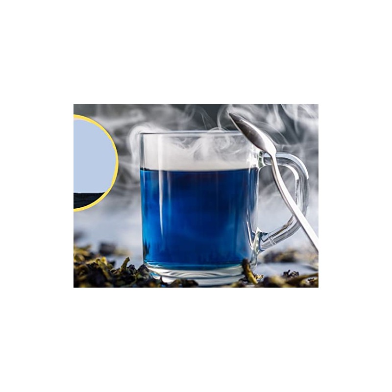 - The blue tinge is only visible under direct light at the surface of the tea.