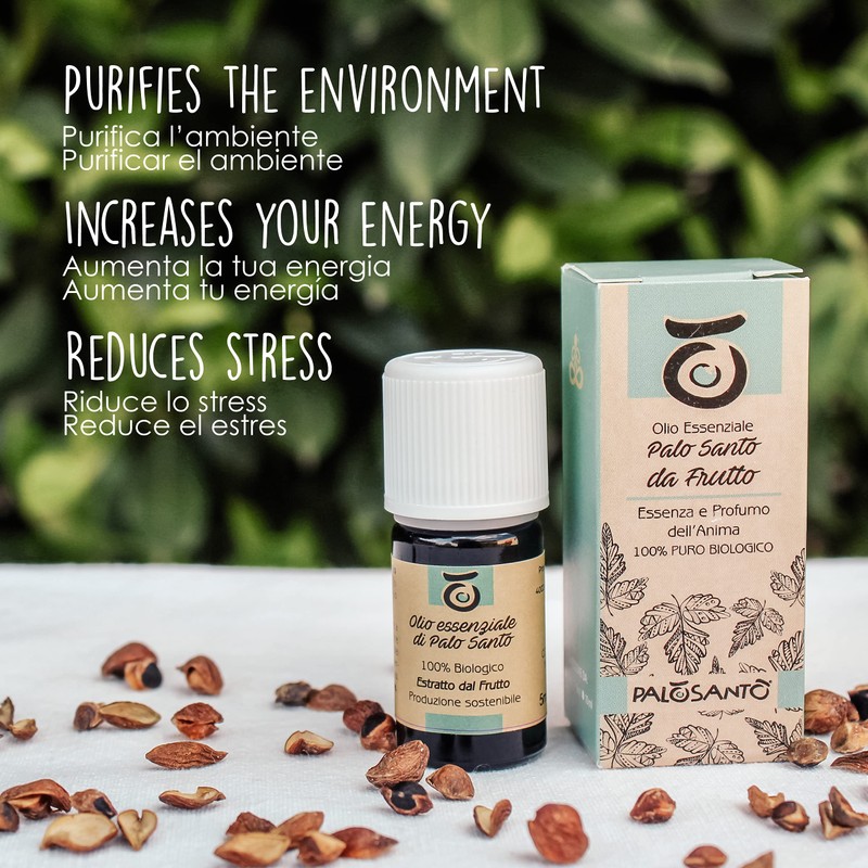 - Essential oil obtained by steam distillation from the fruits of Palo Santo, originating from Ecuador. It is distilled from a flower that was first a bud, now a fruit, and which then breathes life into a new Palo Santo tree.