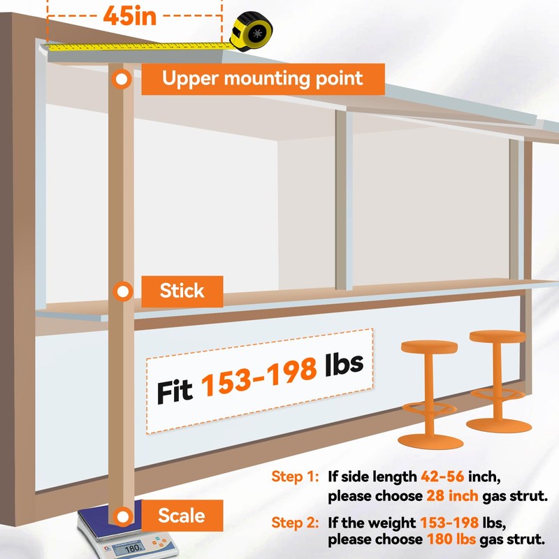 - [180 lbs Strus Info] Extended Length: 28 inch,Compressed Length:16.20 inch. Each strut provides 180 Ibs of force (801 N), sold in 2 pack.Fit for 153-198 lbs,do not compress manually before installation