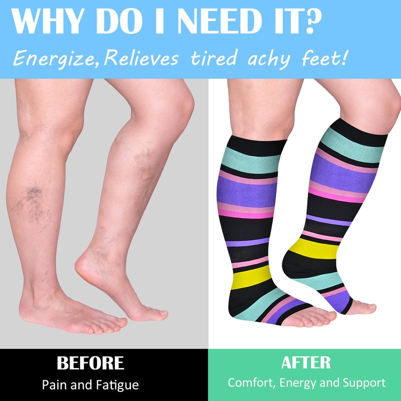 • 【Compression Benefits】Our open toe compression socks for women are different from traditional compression socks. They have different pressure gradients from bottom to top to ensure smooth flow of blood vessels from distal to proximal end. More improved circulation means healthier legs and less pain and swelling. Our graded compression stockings support your legs, reduce fatigue, soreness, prevent injuries, cramps, swelling, and aid in muscle recovery and varicose veins.