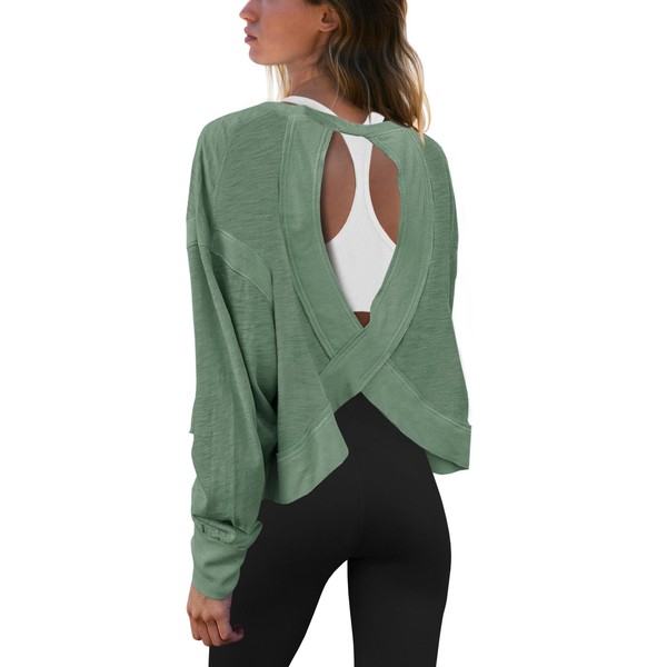 Panadila Womens Open Back Workout Top Long Sleeve Yoga Shirts Thumbhole Tee Shirts Casual Crop Y2k(Army Green,S)
