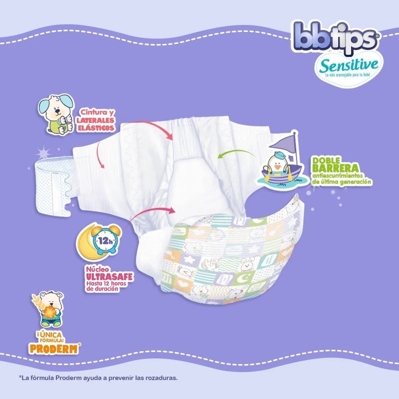 Los pañales desechables BBtips Sensitive cuentan con una fórmula PRODERM a base de extractos naturales, caléndula y avena que ayudan a cuidar y regenerar la piel delicada del bebé. Con un núcleo ULTRASAFE que ofrece hasta 12 horas de protección y una tecnología EXTRA-SOFT que proporciona suavidad y confort, protegiendo la piel sensible. Sus laterales suaves y cintura elástica aseguran un ajuste óptimo al cuerpo, comodidad y libertad de movimiento.