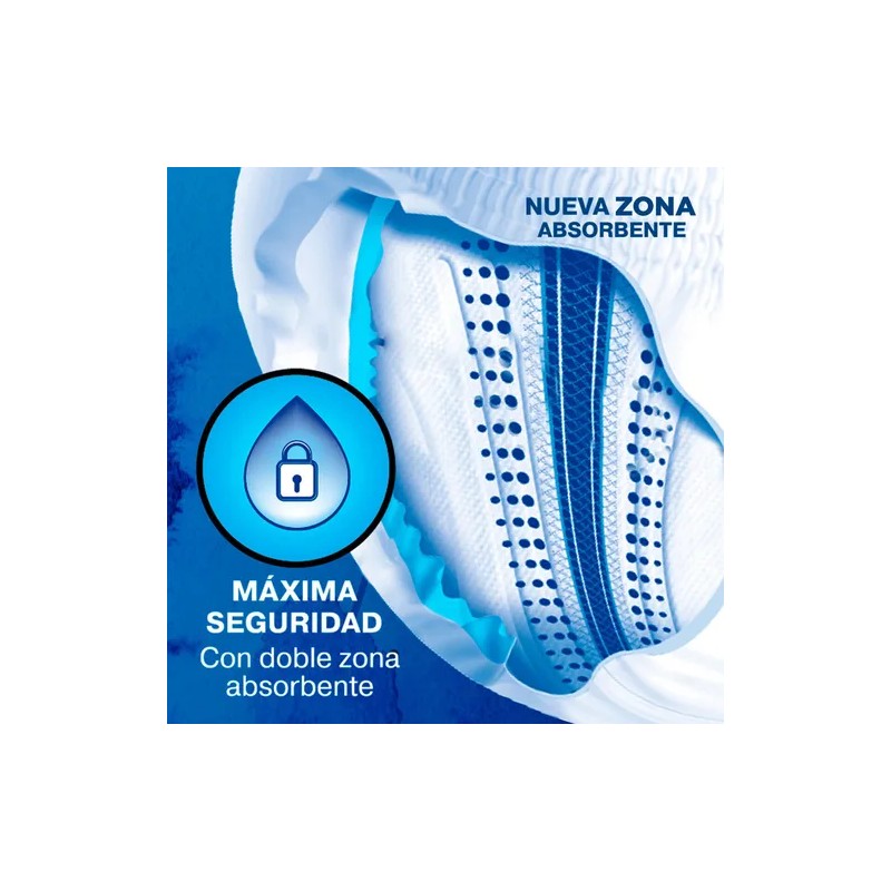 - Su doble centro absorbente y barreras reforzadas anti-escurrimiento te brindarán máxima seguridad y la mayor sequedad para prevenir irritaciones.