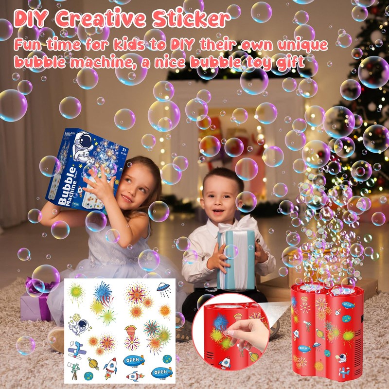 - [Bubbles like Fireworks Shooting] Fireworks are a symbol of cheers and dreams, we integrate this beauty into bubble machine, one button start, the bubbles shoot up like the colorful fireworks blooming in the air, bring a happy fireworks feast for kids and family. Included a creative sticker, possible for you DIY a unique fireworks bubble machine, giving the double cheerful.