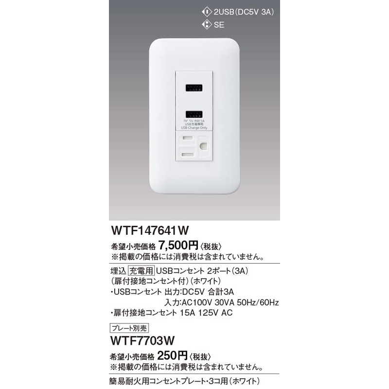 Panasonic Cosmo Series Wide 21 WTF147641W Embedded Charging Outlet 2 Ports, 3A, Grounding Outlet with Door, White