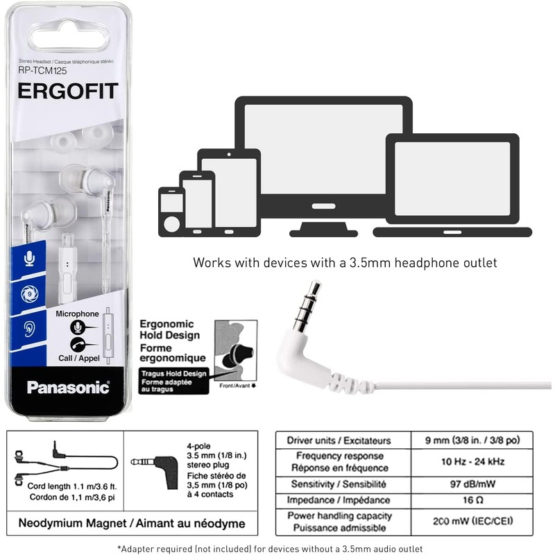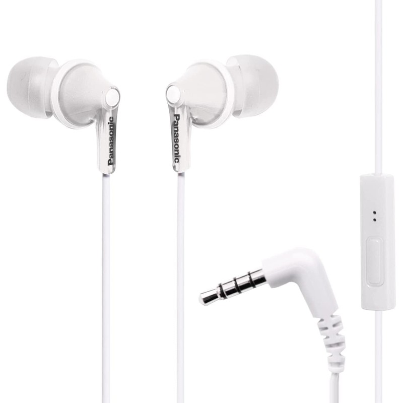 Panasonic ErgoFit Wired Earbuds, In-Ear Headphones with Microphone and Call Controller, Ergonomic Custom-Fit Earpieces (S/M/L), 3.5mm Jack for Phones and Laptops - RP-TCM125-W (White)