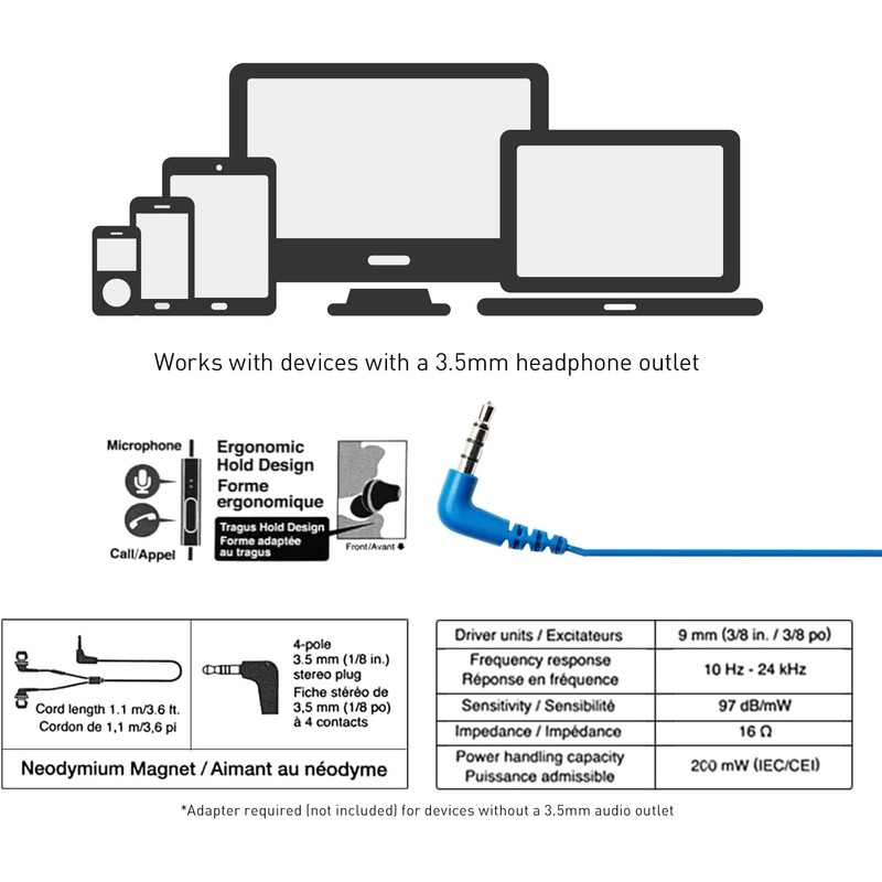 - Microphone & Call controller: with an integrated microphone and call remote, these headphones are compatible with 3.5mm Jack Apple (iPhone/ iPod/ iPad), Android and Blackberry Audio and smartphone devices *requires lightning plug adaptor for iPhone 7 and later models (not included)