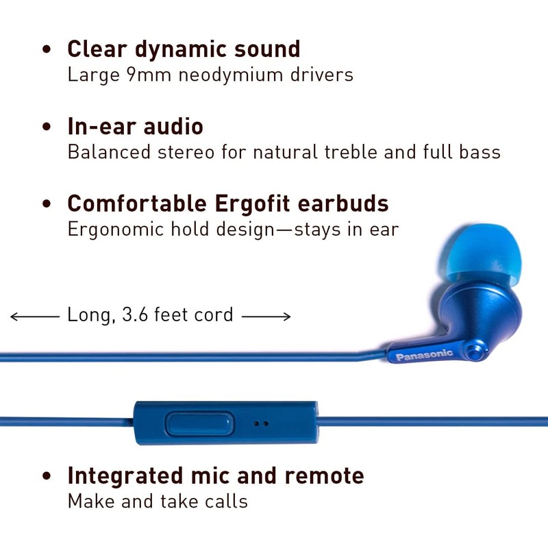 Panasonic ErgoFit Wired Earbuds with Microphone, 3.5mm Jack Headphones with Mic and Call Controller, Ergonomic Custom-Fit Earpieces (S/M/L), for Phones and Laptops - RP-TCM125-AA (Metallic Blue)