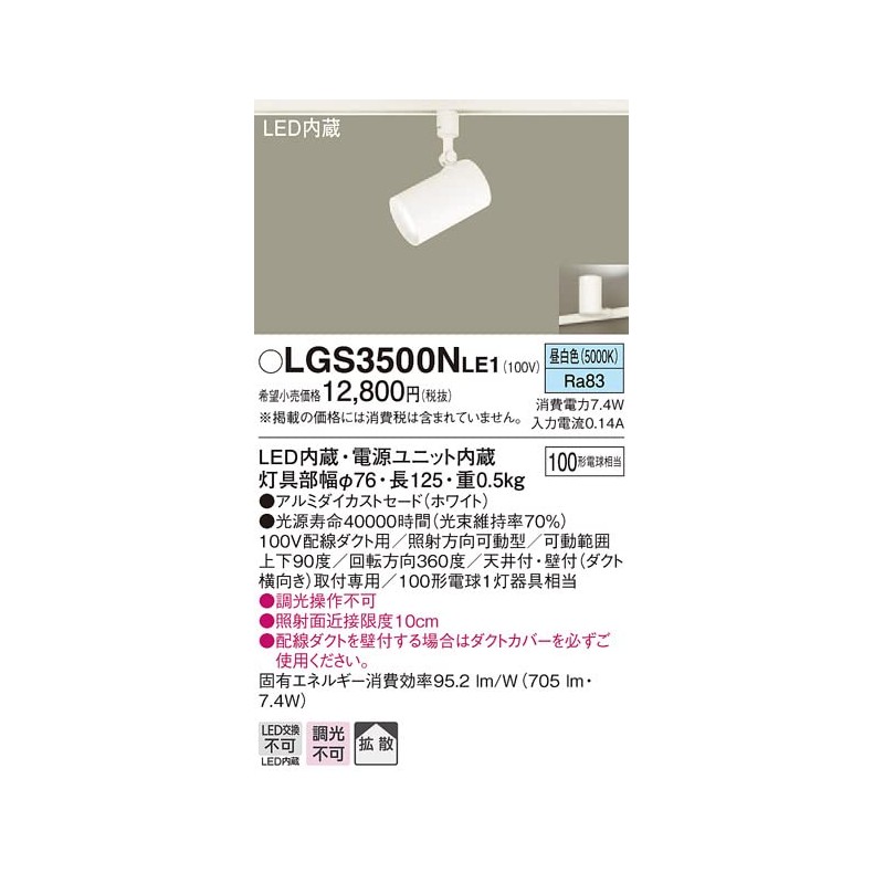 Panasonic LGS3500NLE1 Spotlight, Wiring Duct Mounting, Daylight White, Diffused, 100 Shapes, White