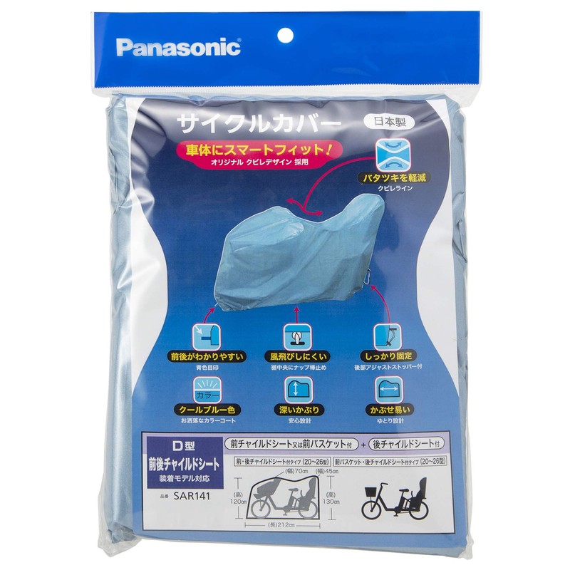 Panasonic SAR141 Bicycle Cover, D-type, Front and Rear Child Seat, Bicycle, Cool Blue, Total Length: 65.0 - 74.8 inches (165 - 190 cm)