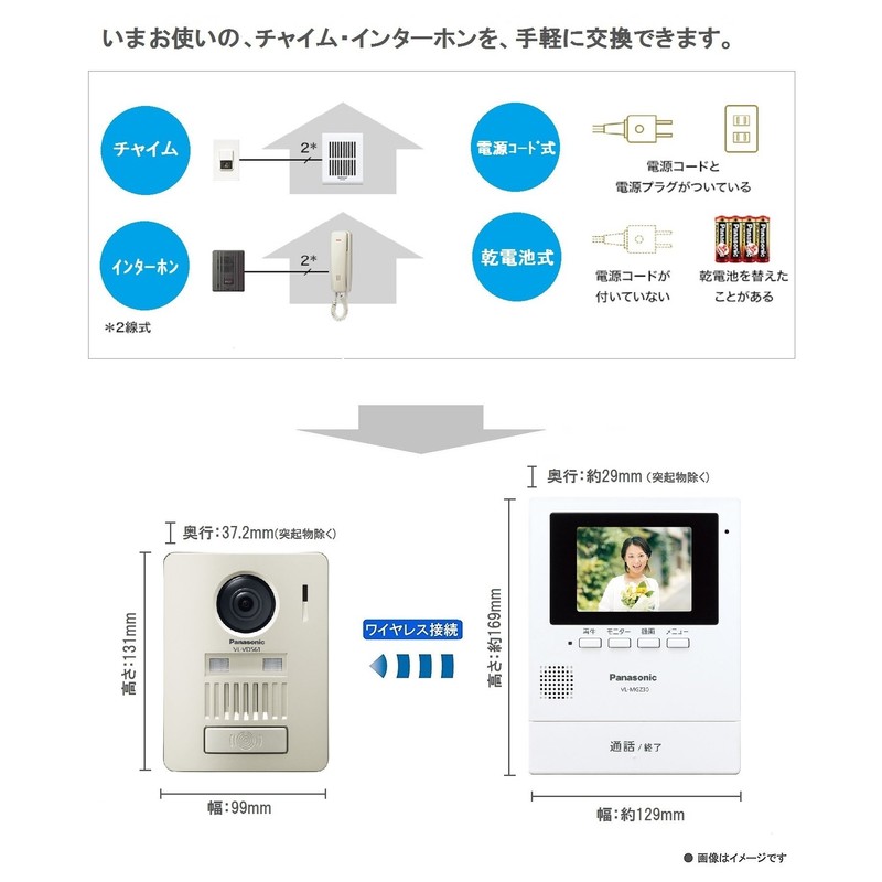 - Wirelessly connect the monitor and the wireless entrance intercom No wiring is required, so it is easy to replace
